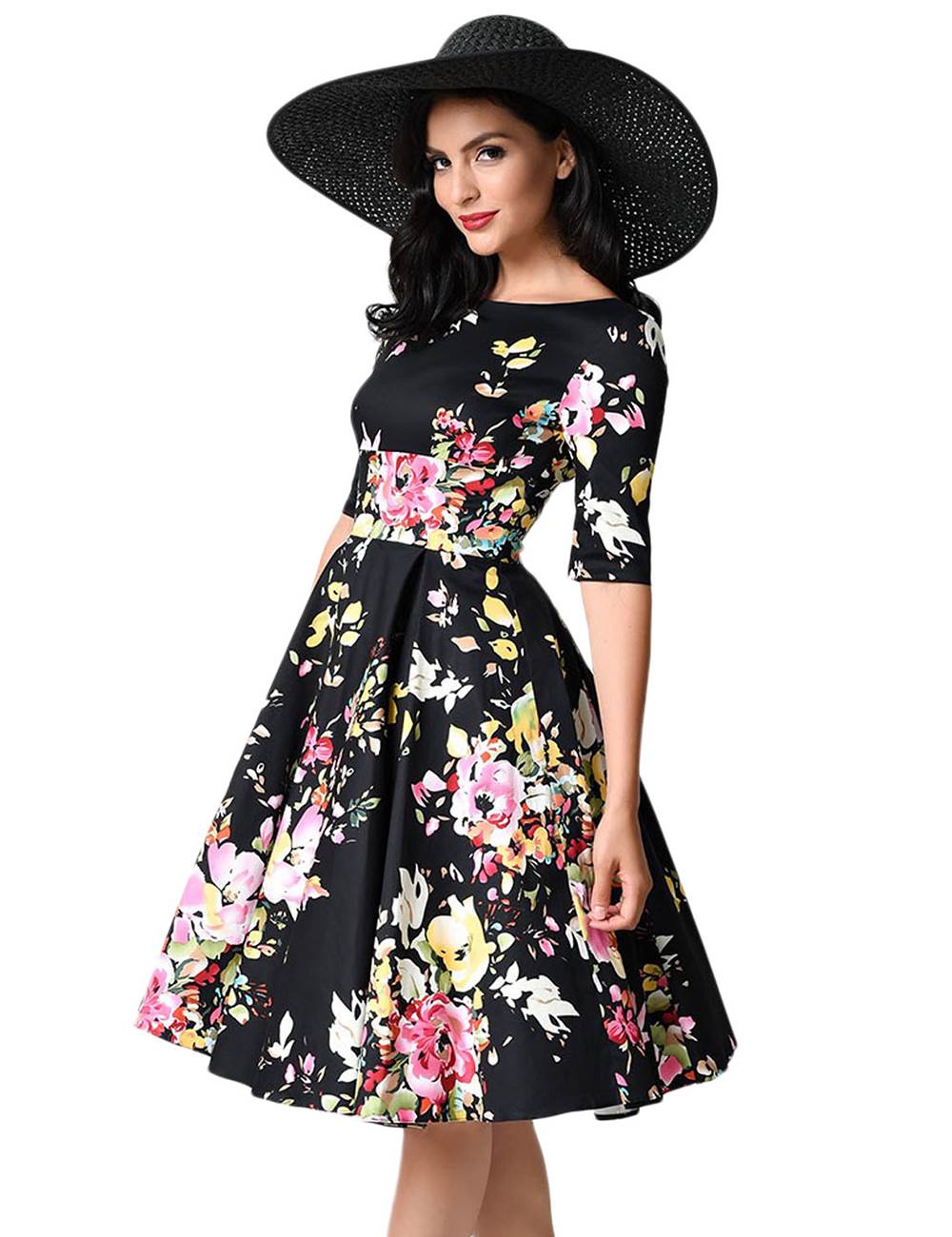 Half Sleeve Black Vintage Style Floral Swing Dress
