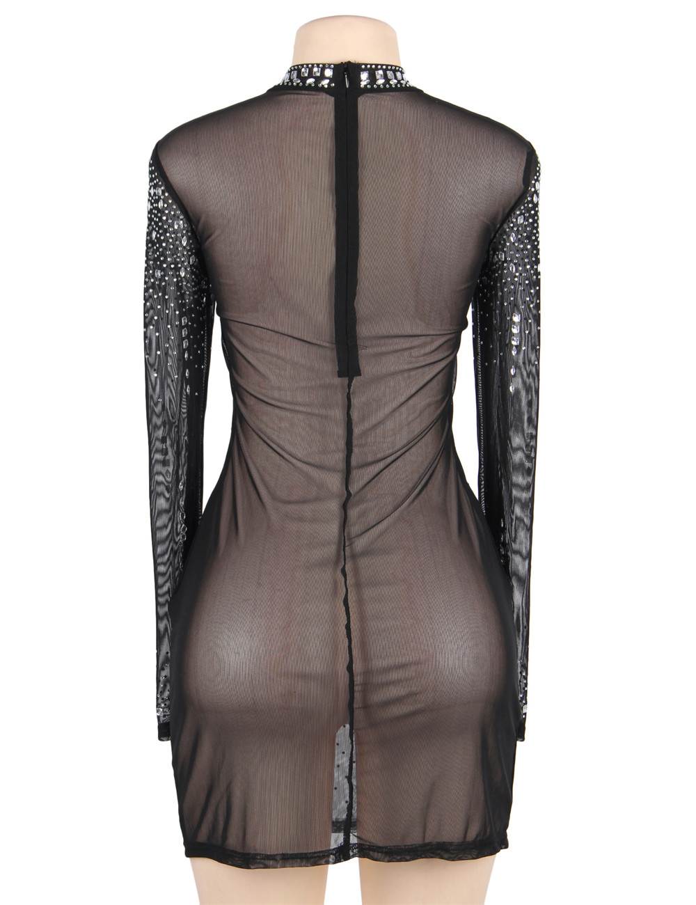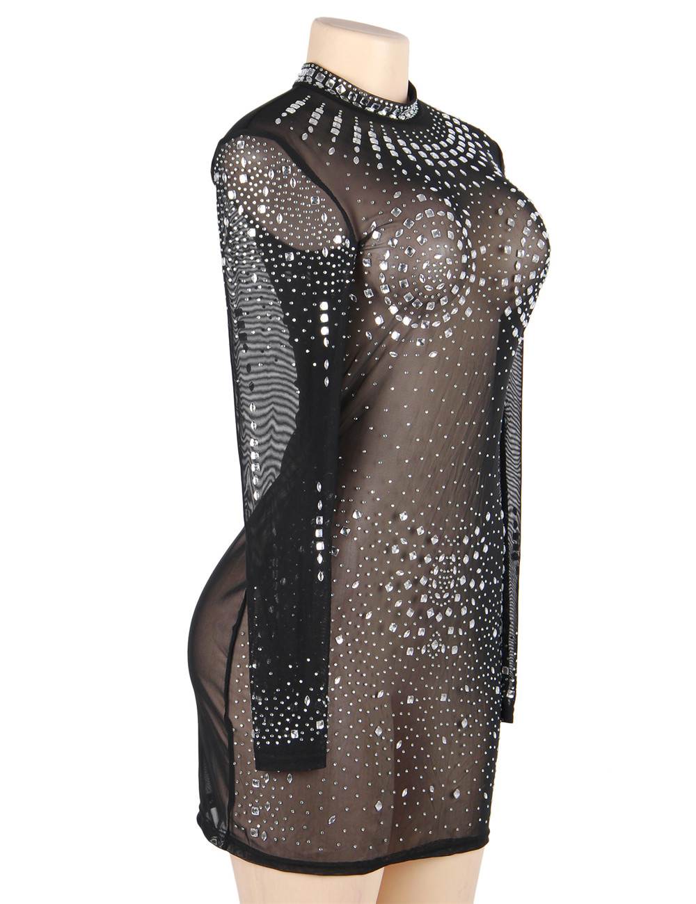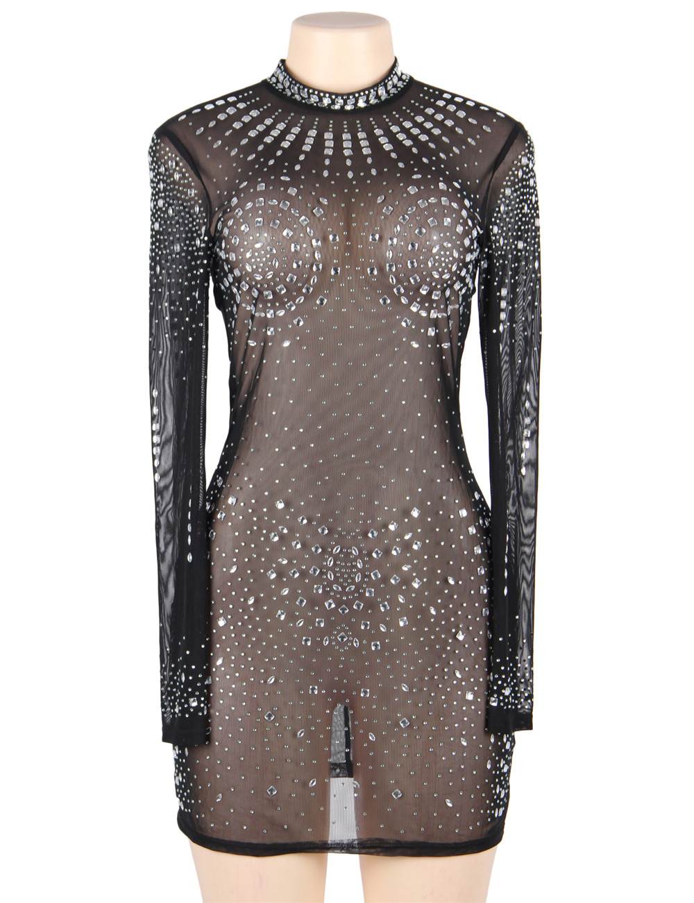 High Neck Long Sleeveled Mesh Rhinestone Sexy Women Nightclub Transparent skirt